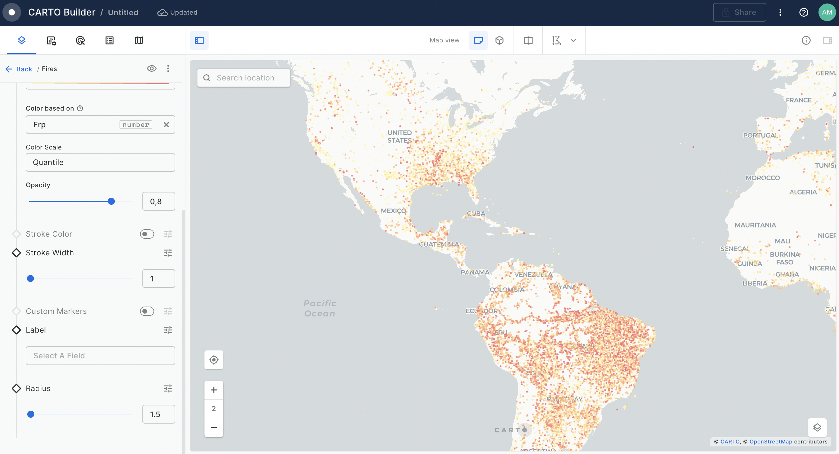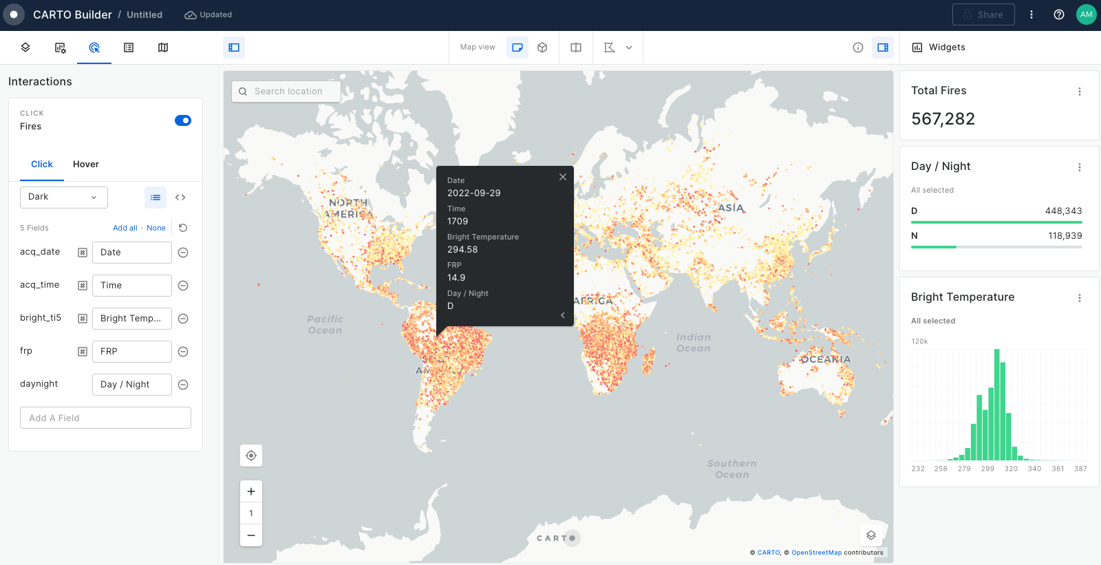With CARTO Builder, you have a wide range of choices when it comes to basemaps. For our current data, the CARTO Dark Matter provides an apt background, highlighting the fires.